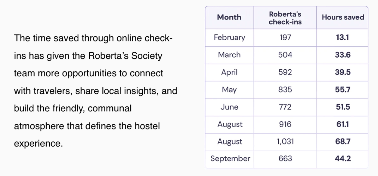 At Roberta’s Society, a vibrant and community-focused hostel known for its welcoming atmosphere and modern amenities, the benefits have been remarkable. Over several months, the team has saved hundreds of staff hours through AeroGuest digital check-ins, averaging roughly 48 hours saved every month.